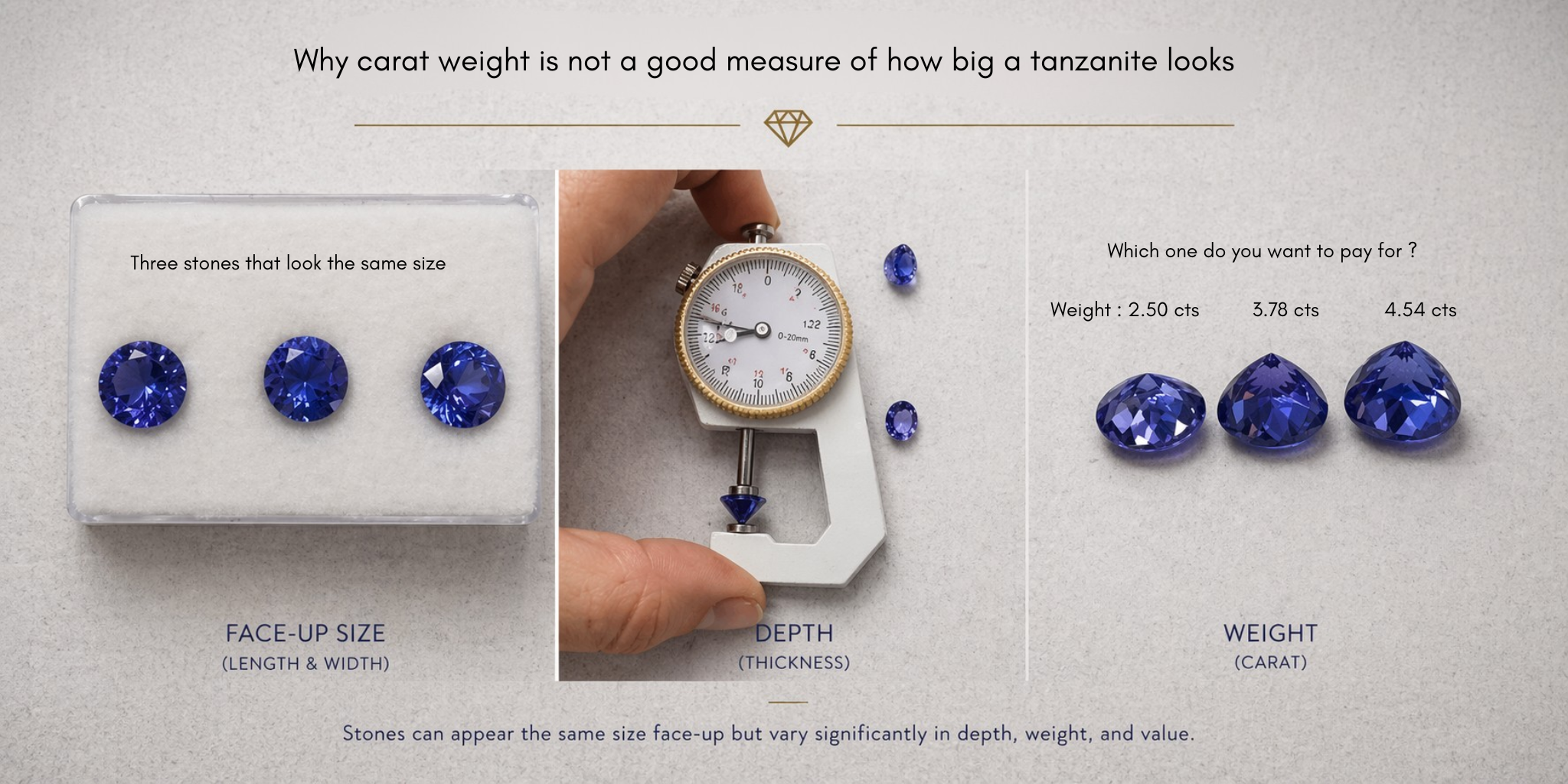 Unlike for diamonds, carat weight alone may not accurately reflect the size of your tanzanite. Because of variations in cut, it is easy for two colored stones with identical carat weight to look completely different. Thus, the best way to judge a tanzanite’s actual size is its “face-up”, or the diameter measurements of length and width.