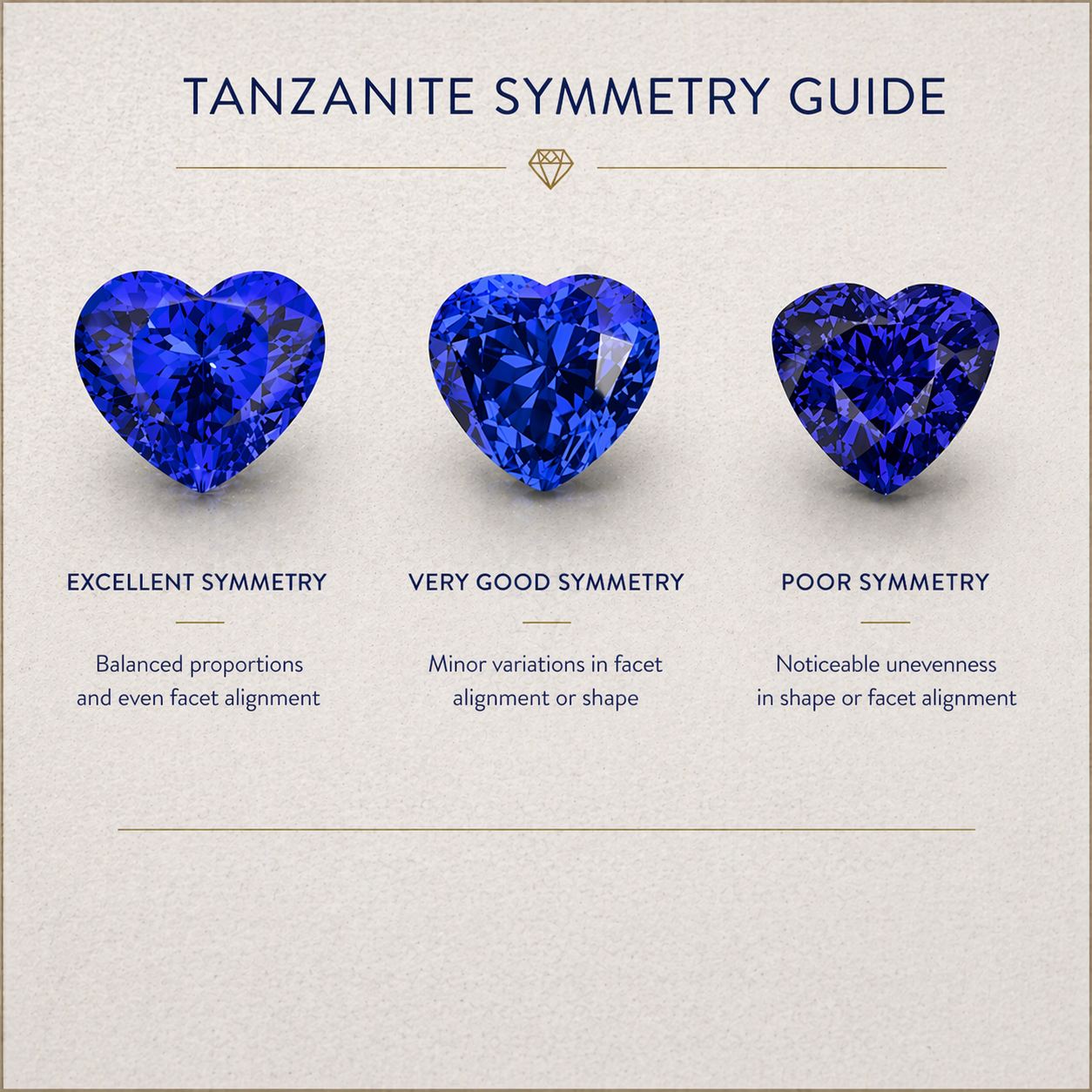 A well-cut tanzanite will display the gemstone’s color to its best ability, look symmetrical when viewed from above, and reflect light at the proper angles to create brilliance and sparkle.
