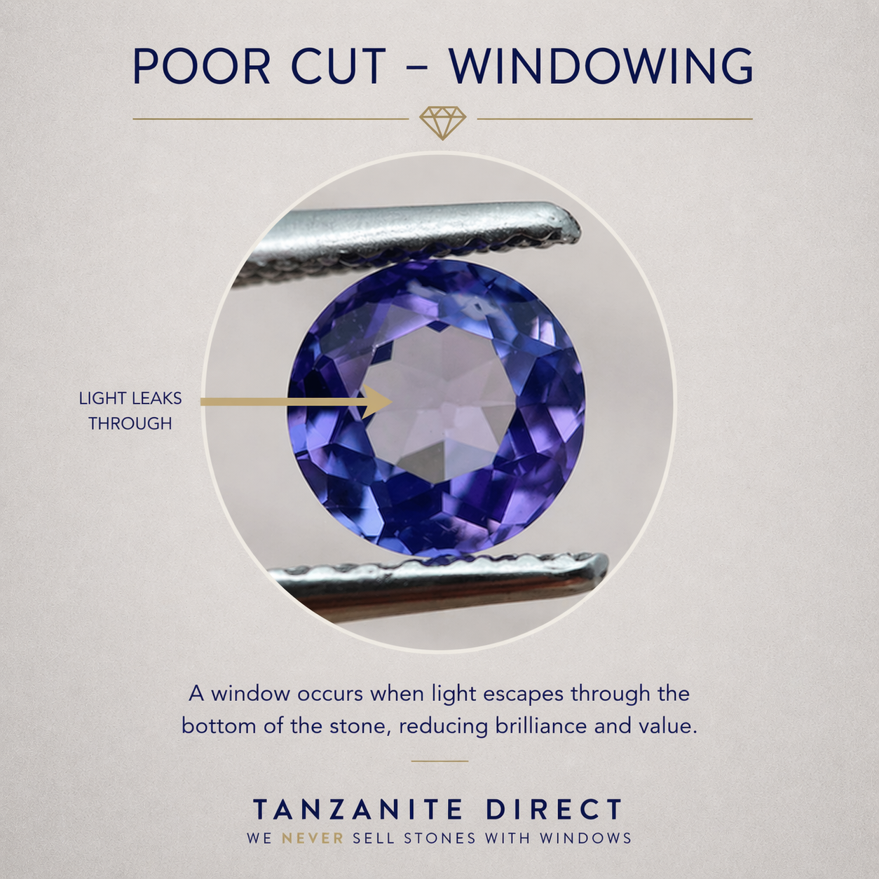 A window in a gemstone is a big “see-through” area typically visible in the center of a faceted stone. It is caused by a shallow or poorly executed cut.
