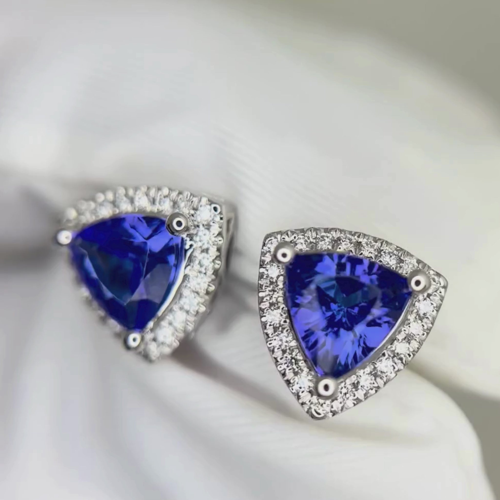 These 18K white gold stud earrings feature flawless, striking trillion-cut tanzanite gemstones framed by a halo of sparkling round diamonds. With the tanzanites flawless clarity and their deep violet-blue brilliance they are beautiful examples of fine tanzanite in a classic setting. Actual pair for sale shown in video.