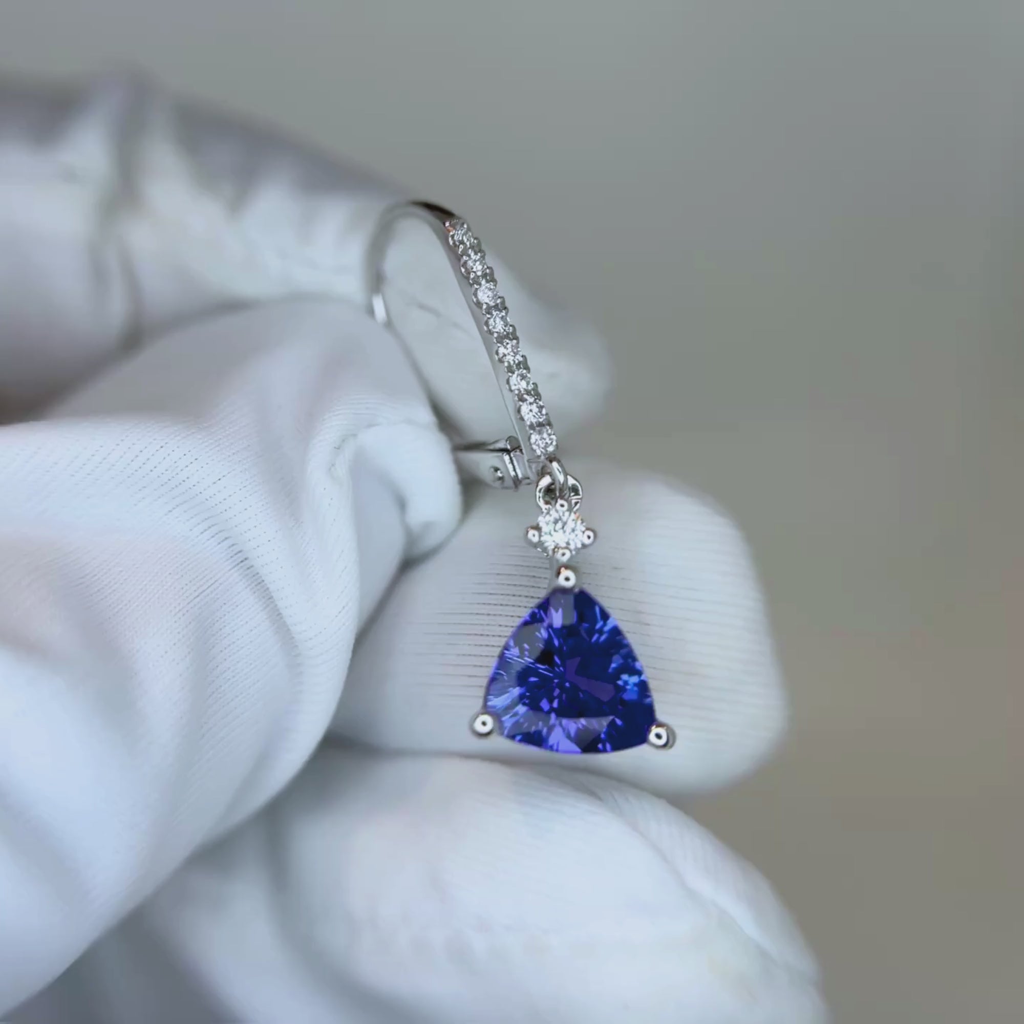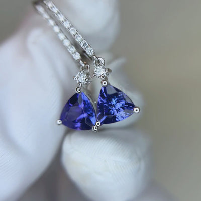 These elegant earrings feature beautifully faceted tanzanite gemstones with a soft violet-blue hue, gracefully accented by sparkling round diamonds. Their refined drop design adds a touch of movement and sophistication, making them the perfect choice for both everyday wear and special occasions.
