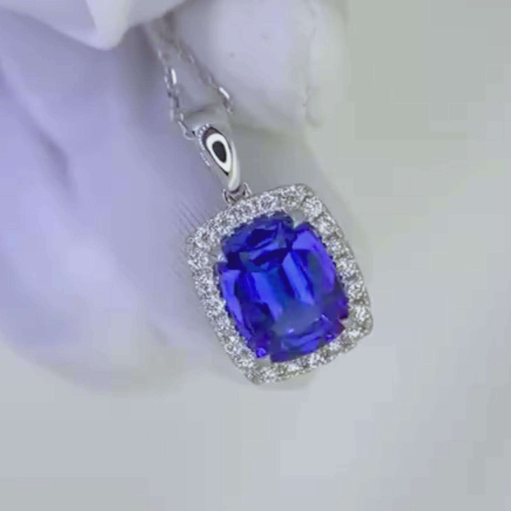 A stunning cushion-cut tanzanite pendant of exceptional quality. The antique-style cushion cut reveals a rich, velvety blue tanzanite weighing over three carats, chosen for its flawless clarity and outstanding beauty. The voluptuous gemstone grades as VB 6/6, also known as AAA+ tanzanite. This particular stone is mainly deep blue, with a hint of tanzanites famous violet aura when tilted.
