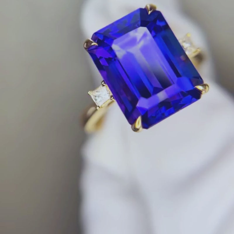 This emerald-cut tanzanite ring showcases an awe-inspiring 8.79-carat tanzanite set in 18k gold. Flanked by two square princess-cut diamonds, the design is intentionally balanced so the tanzanite remains the unmistakable focal point.