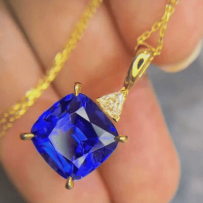 A standout cushion cut tanzanite pendant, displaying an impressive 8.81-carat tanzanite of the deepest blue. The cushion cut tanzanite is topped by a 0.20-ct trillion-cut diamond, and held by a yellow gold chain impeccably made in 18k yellow gold. (The diamond is set in an articulated setting, and moves independently of the tanzanite pendant, lending this piece has extra sparkle and life).