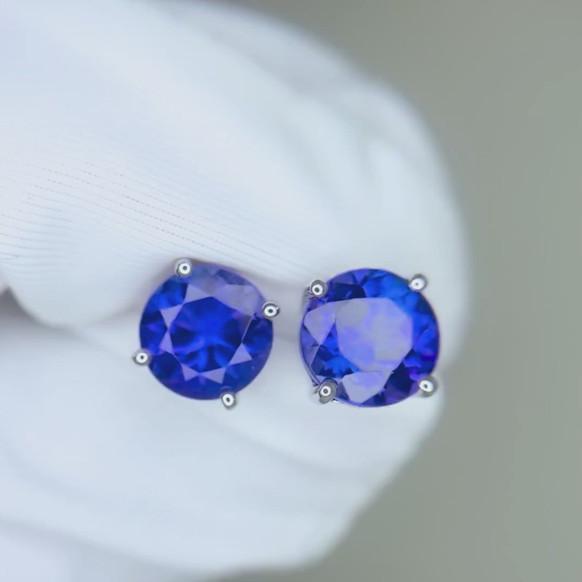 These luxurious stud earrings feature tanzanite gemstones of extraordinary quality, hand-selected for their remarkable depth of color and vivid saturation. Each round-cut stone weighs just over 1.5 carats and displays an intensely rich, velvety violet-blue hue — the most prized and rarest color grade in tanzanite.
