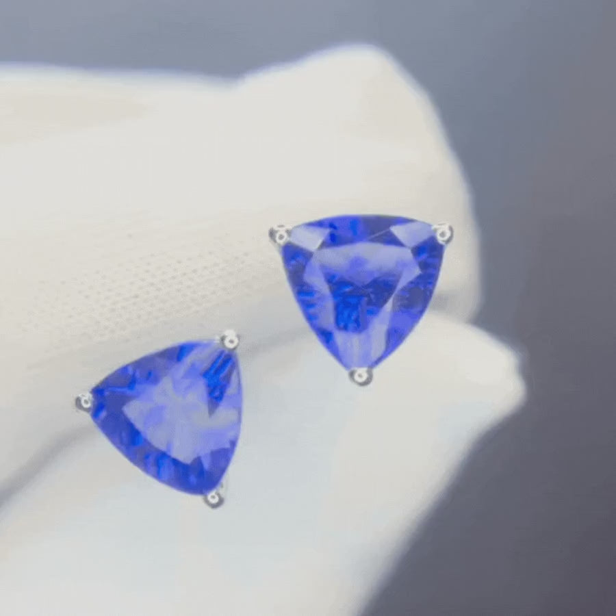 Premier trillion-cut studs with a strong flash of violet. A closer look at these magnificent gems will show you a rich, mesmerizing mix of blue and violet simultaneously.